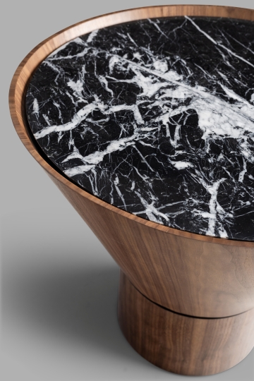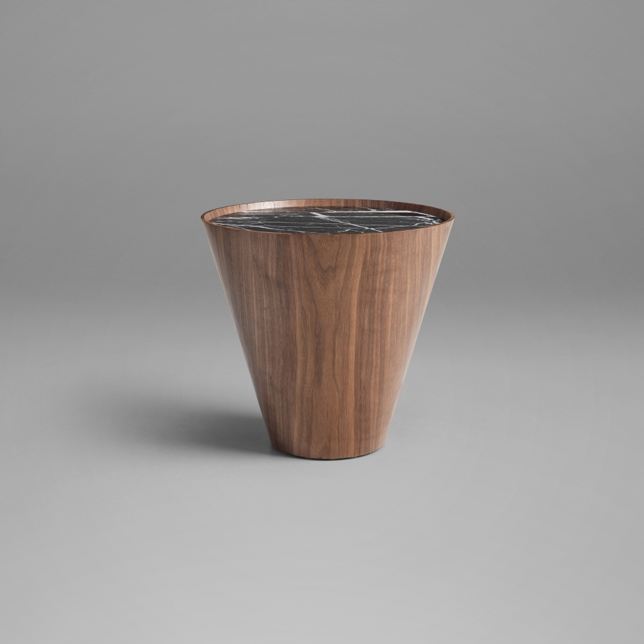 A Mesa Lateral Cone combina materiais nobres composição em uma elegante e impactante. Seu tampo circular, disponível em mármore ou vidro, destaca-se pela sofisticação e pelo acabamento polido que reflete a luz com sutileza, valorizando o material aplicado. Um discreto aro em madeira contorna o tampo, criando uma transição suave entre os elementos e adicionando calor visual à composição. A base em forma de cone truncado, feita em lâmina de madeira natural, confere estabilidade e reforça o caráter escultórico da peça. Inspirada no minimalismo oriental evidente no equilíbrio entre o peso visual do mármore e a leveza da madeira, a cone é uma peça versátil, ideal para ambientes contemporâneos ou ecléticos.