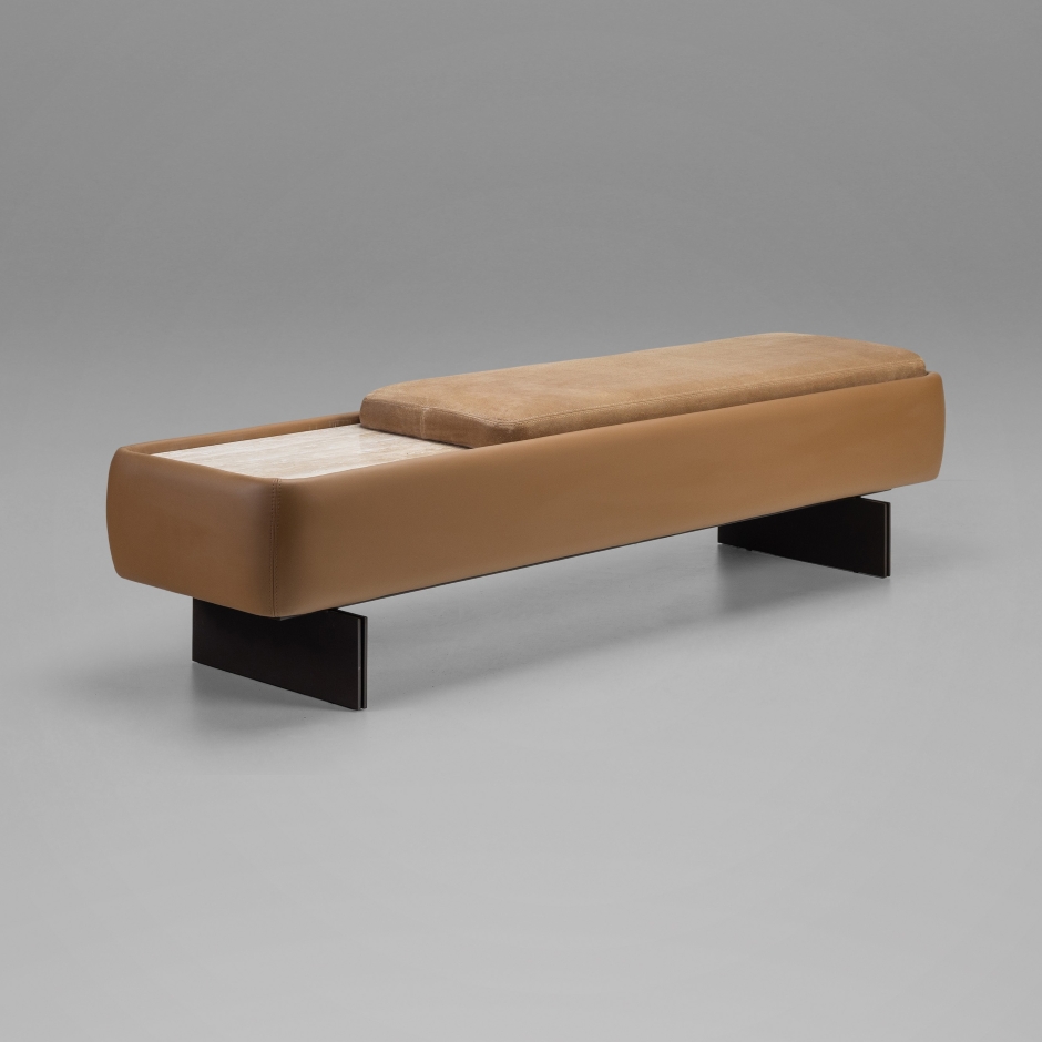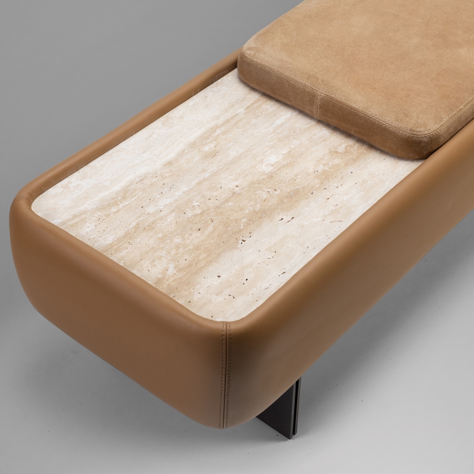 Com design de inspiração modernista, o Banco Moon combina precisão formal e sofisticação. A estrutura revestida em couro destaca os detalhes construtivos e confere elegância ao conjunto. O assento estofado, de linhas limpas e proporções amplas, oferece conforto com discrição. O tampo em pedra natural cria um contraste marcante de texturas, equilibrando a suavidade do estofado com a solidez da pedra. A base metálica, garante estabilidade com leveza visual.