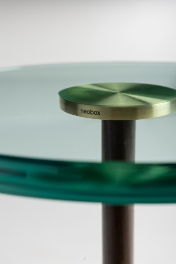 A Mesa de Apoio Dot é uma peça que faz referência ao modernismo e à estética minimalista. Seu tampo circular em vidro possui bordas polidas que refletem a luz com sutileza, revelando um tom esverdeado sofisticado. No centro, um discreto detalhe metálico fixa o tampo à estrutura, adicionando um toque de refinamento à composição.